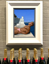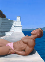 "We were wandering aimlessly in Hydra, taking in the white-washed buildings, some marked by the vibrant colours of bougainvillea flowers, when the shaded lane opened up to a spectacular waterfront, distant mountains above deep blue sea, and a striking and mysterious staircase disappearing into a cloudless sky. I knew straight away it would be a wonderful painting subject and a perfect setting for a solitary sunbather.” said Watson.