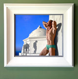 Evoking a still from a cinema screen, late afternoon light saturates this breathtaking and intriguing Greek scene, dominated by a handsome blonde sunbather who possesses the physique of a young Greek god.